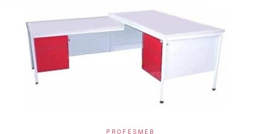 Metalowe meble biurowe.Biurko sekretarskie, kątowe, wyposażone w dwa kontenerki po trzy szuflady w każdym z nich. Dostawka może być z prawej lub lewej strony biurka – w zależności od potrzeb. Stelaż biurka wykonany ze stalowych profili zamkniętych o przekroju czworokątnym za stopkami wyrównującymi wysokość. Blat grubości 25 mm z powłoką z melaminy. Dostarczane w elementach.Dostępny w 13 kolorach.