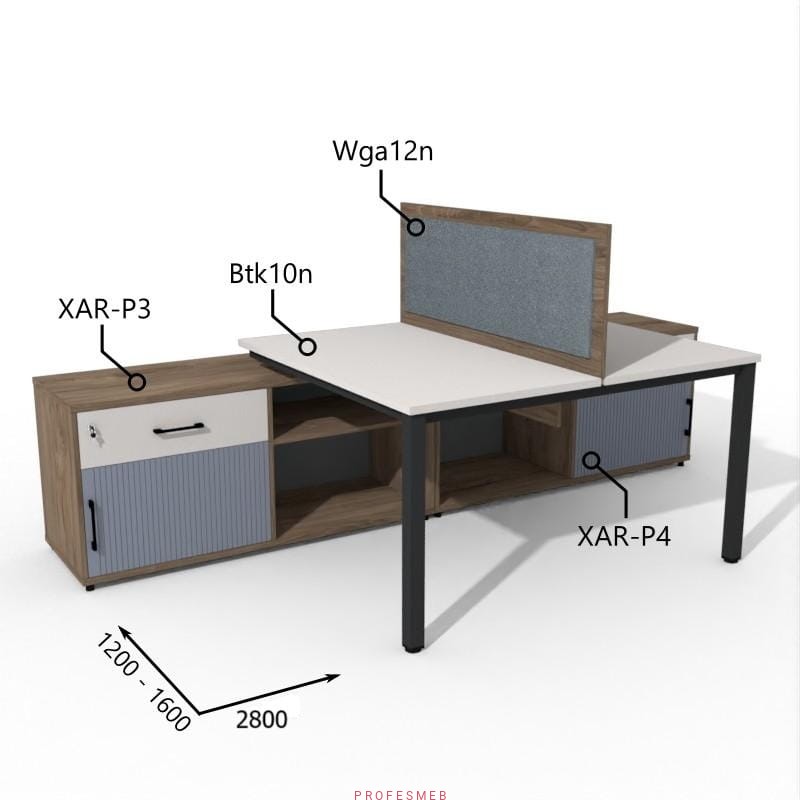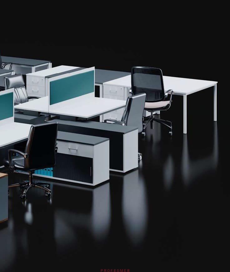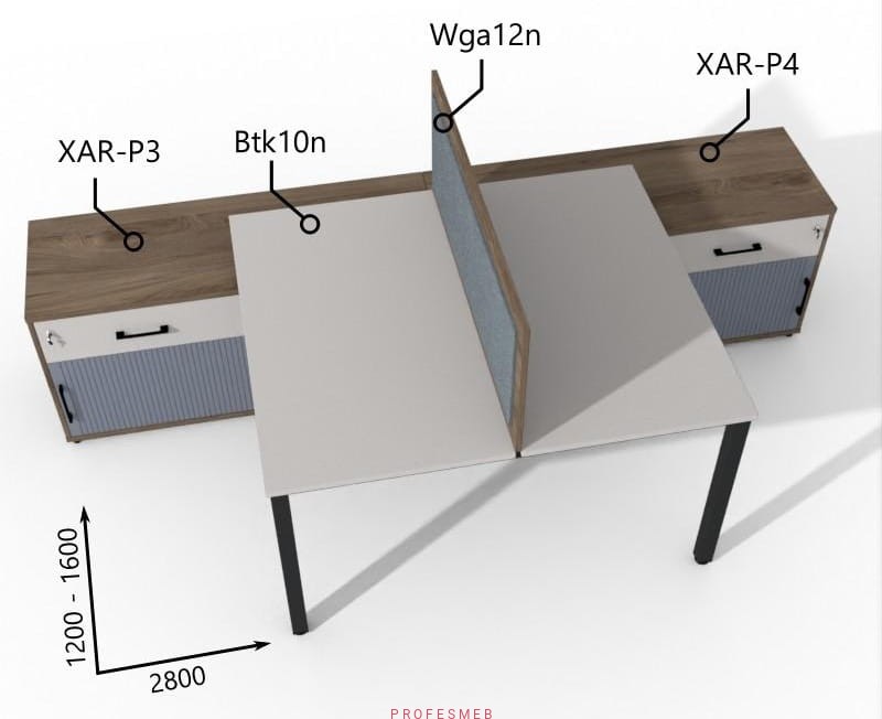 Biurko dwustanowiskowe typu bench nakładane + 2 pomocniki – komody wyposażona w drzwi przesuwne + szufladę zamykaną + półki, dodatkowe wyposażenie stanowi przegroda - panel tapicerowany montowany pomiędzy biurkami.