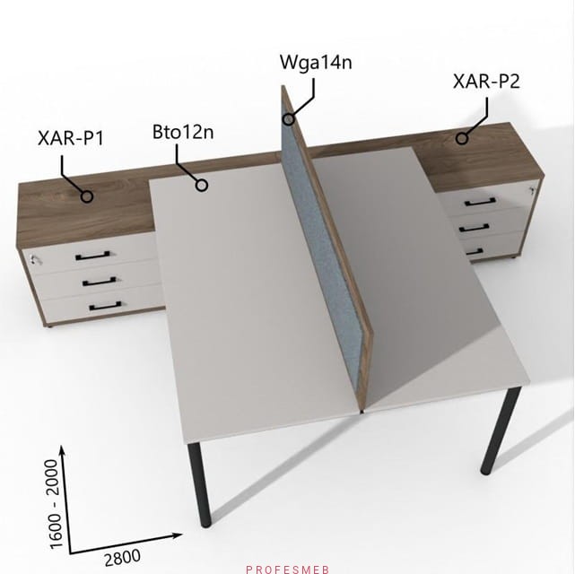Biurko dwustanowiskowe z Komodami i szufladami oraz przegrodą 1600–2000 x2800mm Antrax Togar Bto12n XAR-P1 P2 Wga14n - Zestaw-134