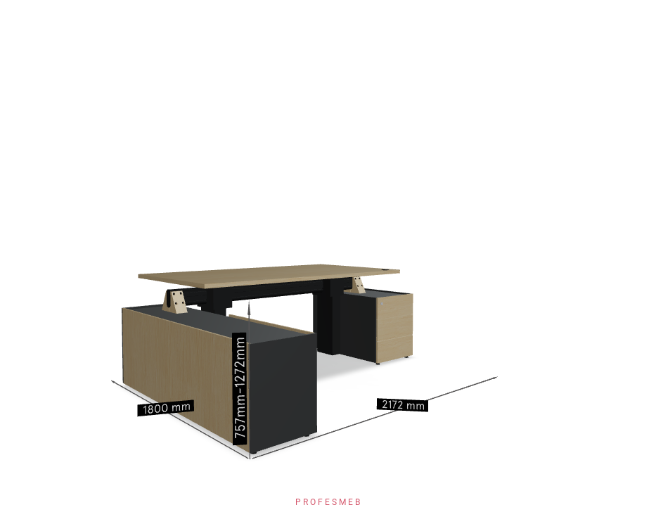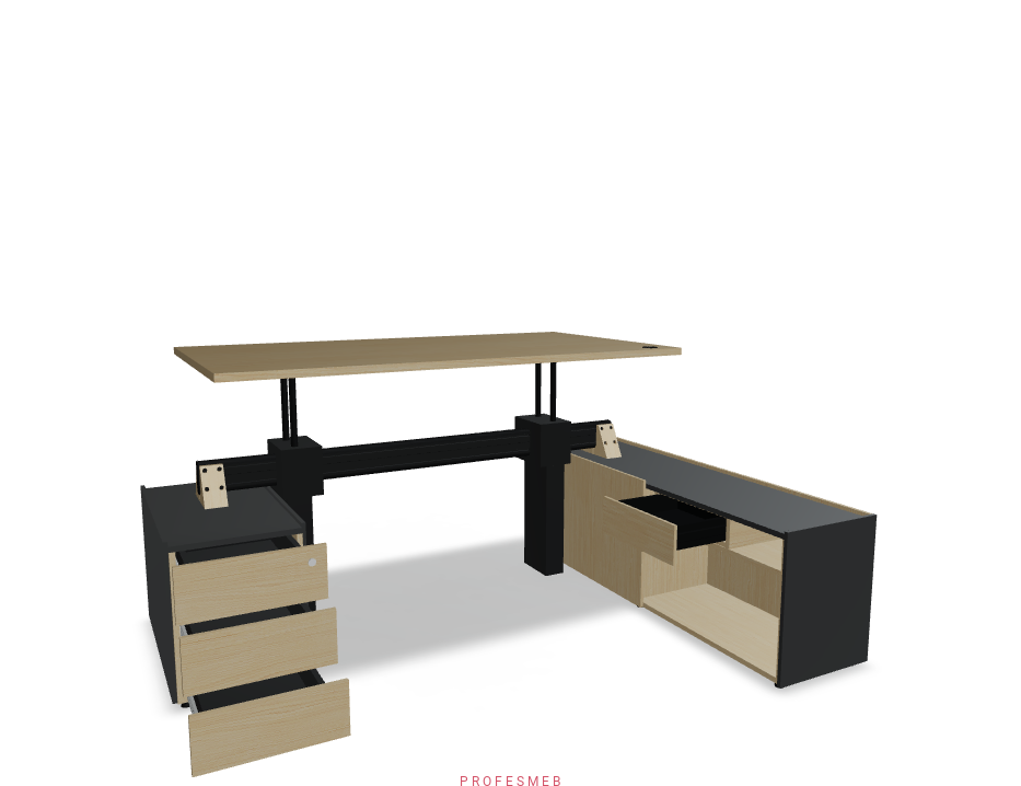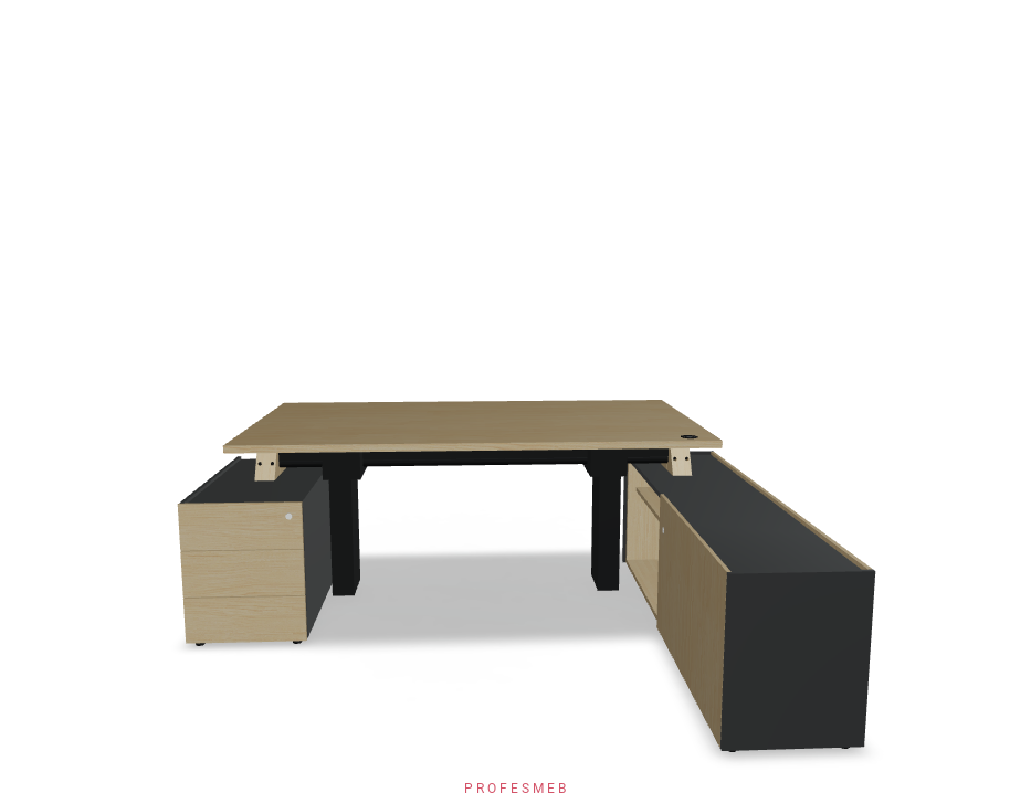 BIURKO Z ELEKTRYCZNĄ REGULACJĄ WYSOKOŚCI BLATU KOMODA Z DRZWIAMI PRZESUWNYMI I KONTENEREK NA KLUCZ ZESTAW PRAWY 2172 x 1800 mm Viga