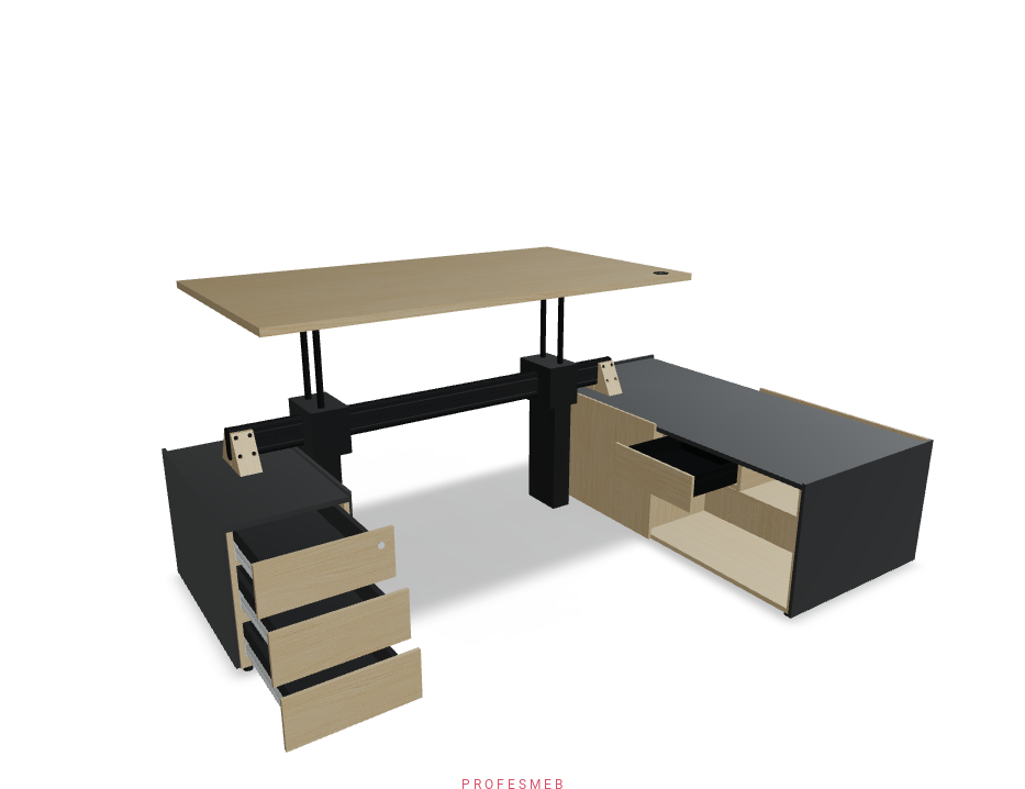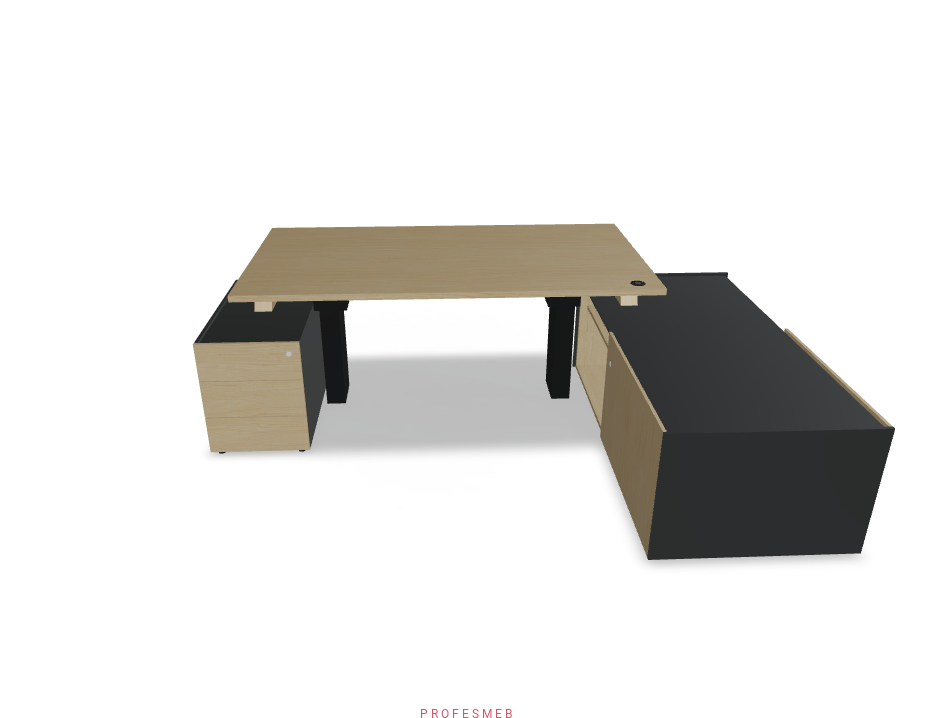 BIURKO Z ELEKTRYCZNĄ REGULACJĄ WYSOKOŚCI BLATU KOMODA Z DRZWIAMI PRZESUWNYMI I KONTENEREK NA KLUCZ ZESTAW PRAWY 2540 x 1800 mm Viga