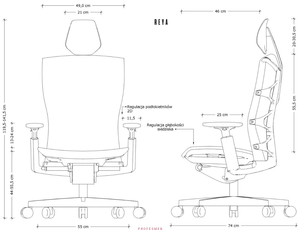 Szukasz fotela, który łączy przewiewny elastomer z mechanizmem SYNCHRON i szerokim zakresem regulacji? REYA ma regulację wysokości i głębokości siedziska, regulowany zagłówek, podłokietniki 2D oraz aluminiową podstawę.