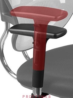 Regulacja w trzech płaszczyznach: góra–dół, przód–tył i na boki. Miękkie, poliuretanowe nakładki zwiększają komfort w pracy przy komputerze.
