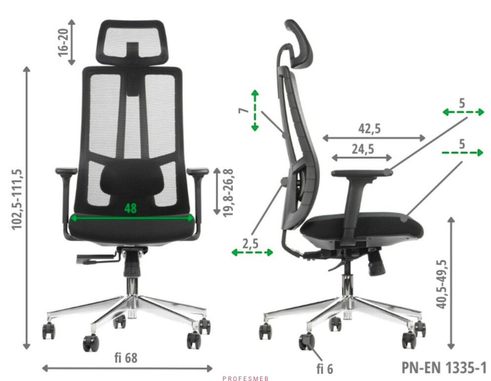 Wymiary Krzesła obrotowego Activ PU:Wymiary ergonomicznego krzesła odpowiadajacego na nowe dyrektywy sprawdz 2025 rok z profesmeb