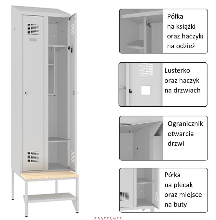 ✅ W szafach SMS każda skrytka jest wyposażona w dwie półki oraz boks na książki z dwoma haczykami na odzież.