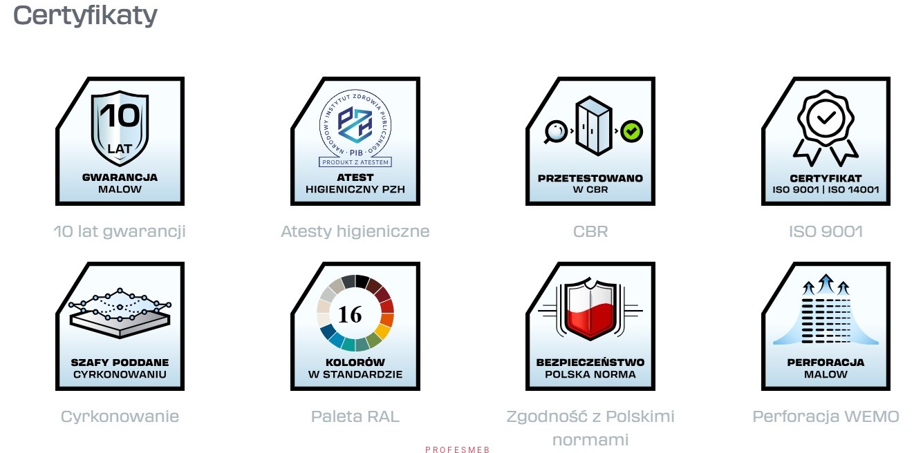 Oferowane przez nas szafki szatniowe i szafki pracownicze otrzymały właściwe certyfikaty i atesty bezpieczeństwa: