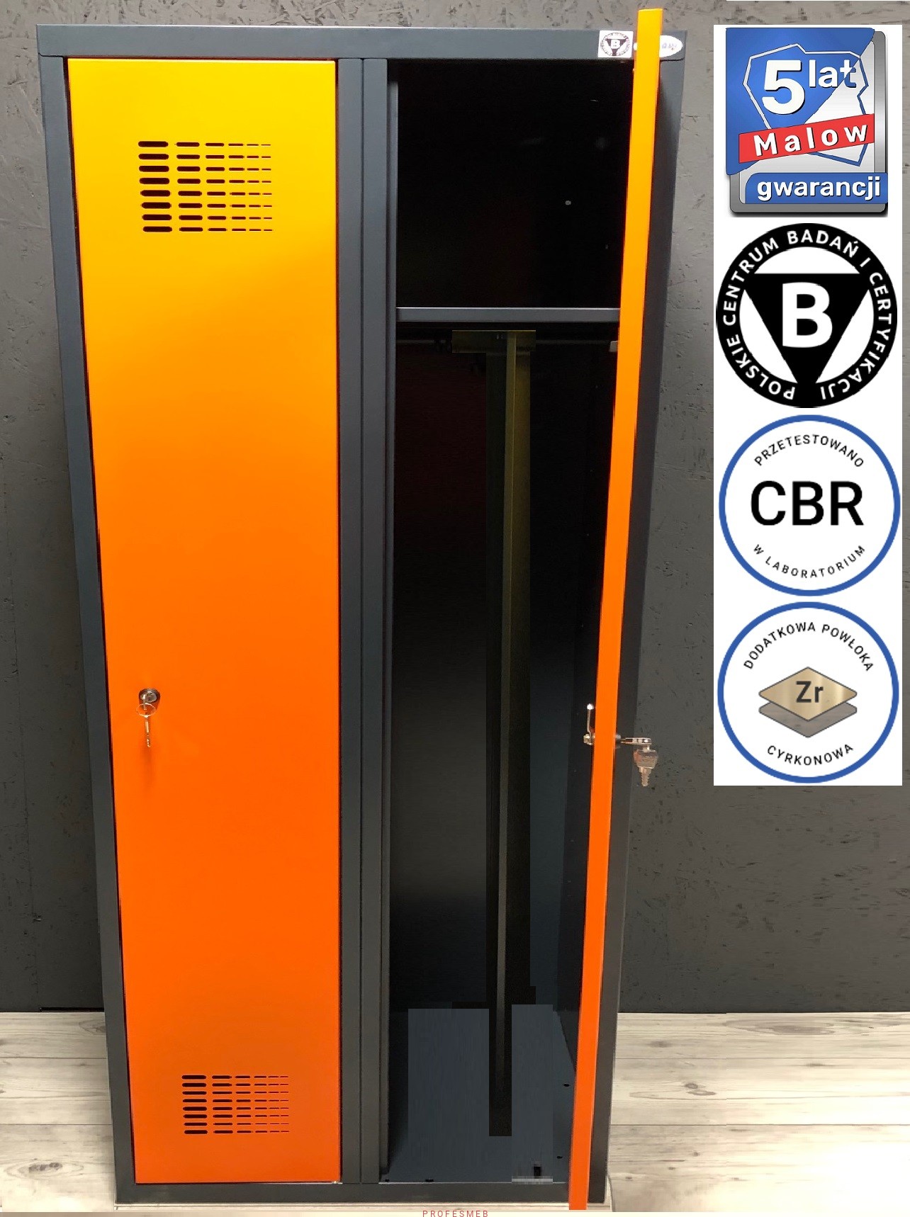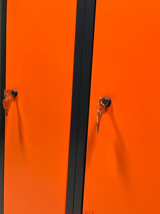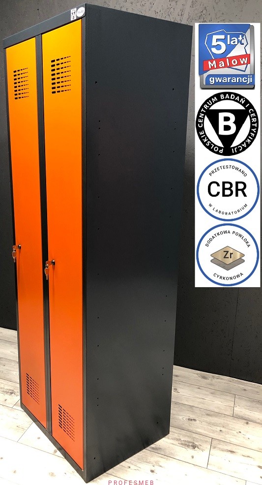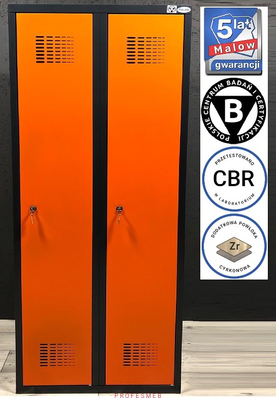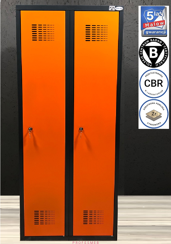 SUM 420 WST Metalowa szafa socjalna ubraniowa BHP dla pracowników dostępna od ręki w ciekawym połączeniu kolorystycznym. Nowoczesna szafka 2 drzwiowa szatniowa z podziałem odzieży - grafitowo pomarańczowa.