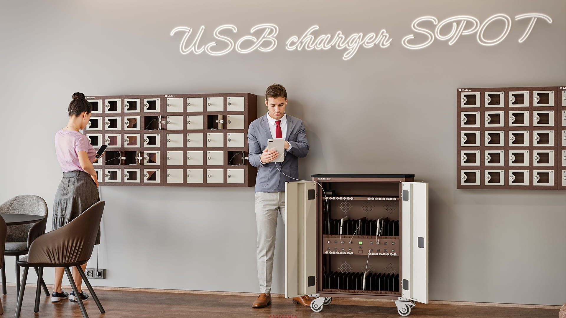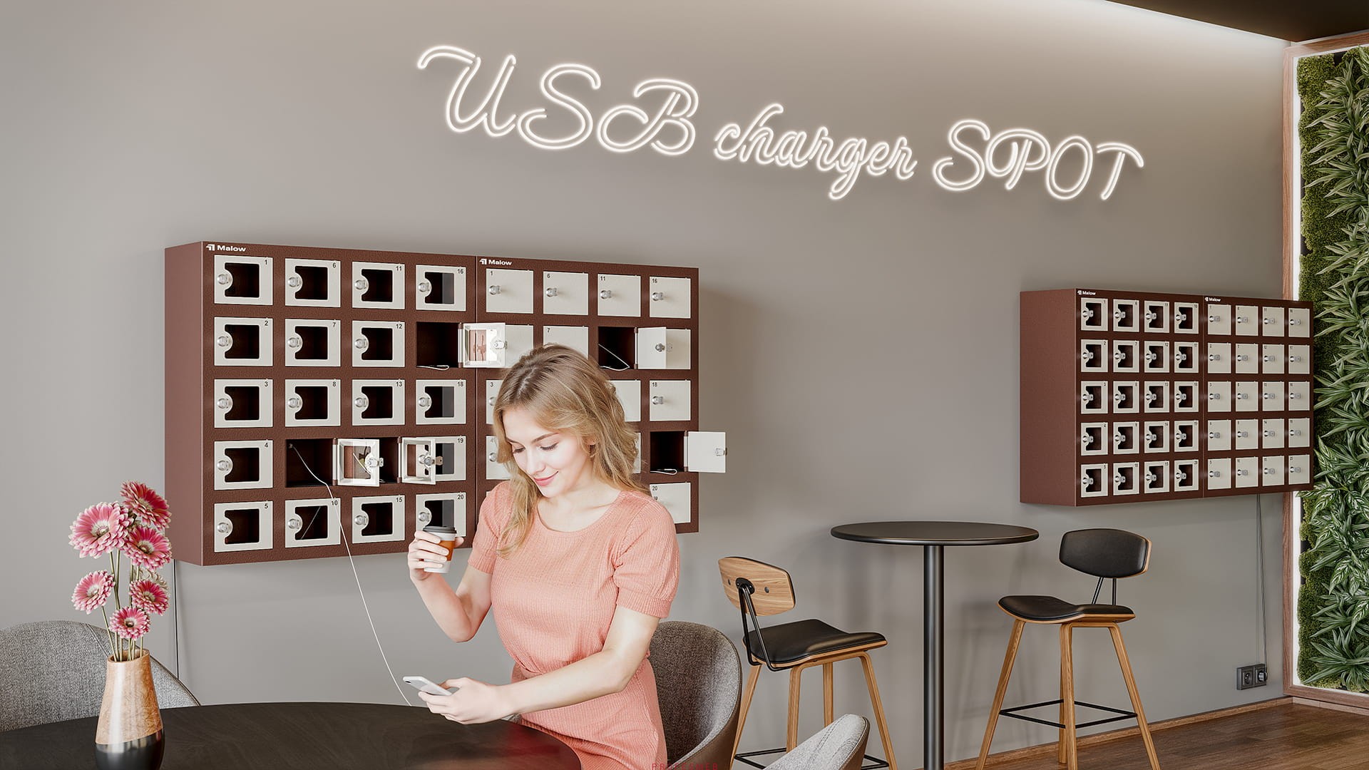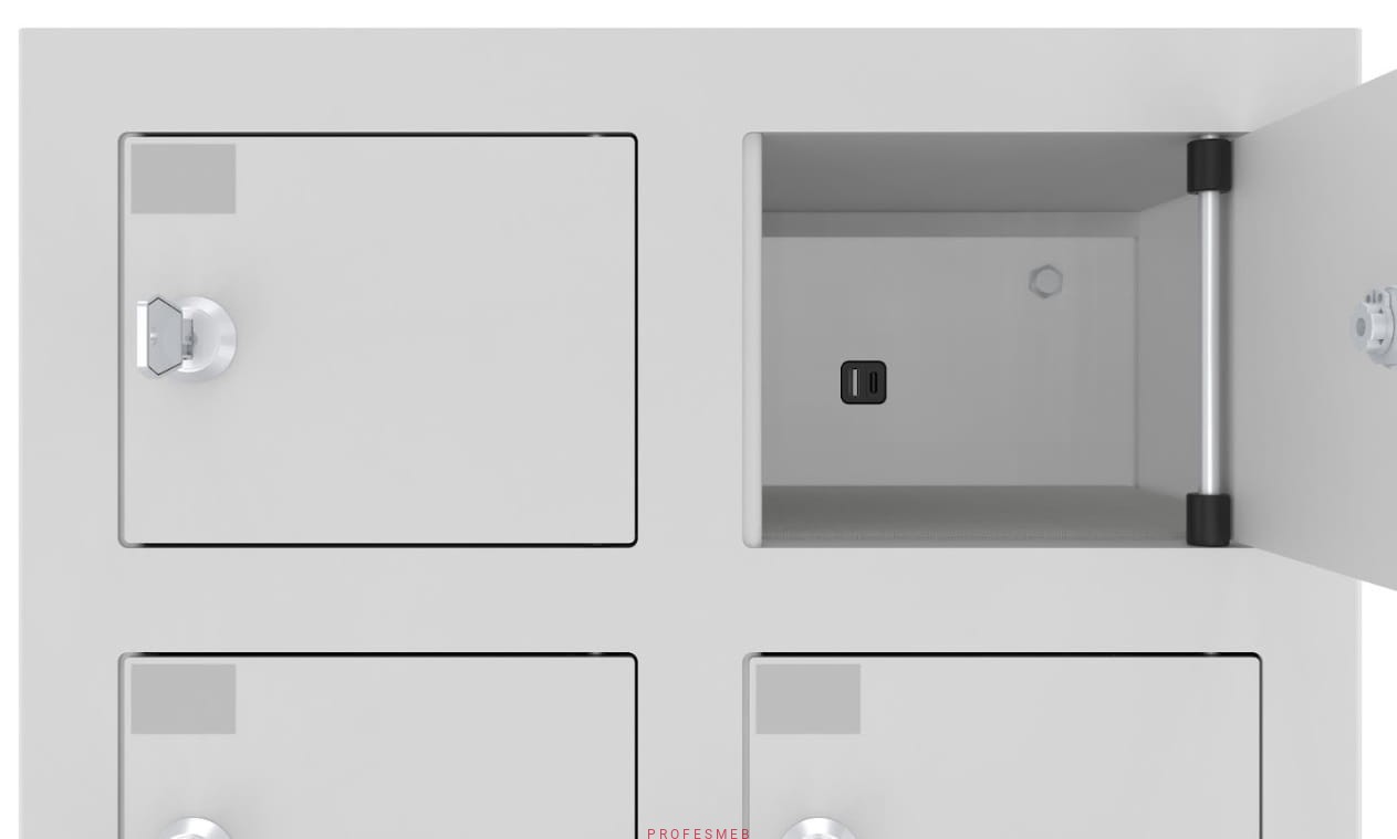 - Bezpieczne ładowanie telefonu – Szafka WSSv to idealne rozwiązanie do ładowania smartfonów w przestrzeniach publicznych. Każda skrytka wyposażona jest w porty USB, w tym USB-C zgodne z dyrektywą UE, umożliwiające szybkie ładowanie nawet nowoczesnych urządzeń.