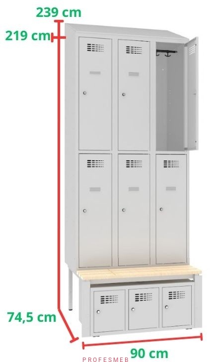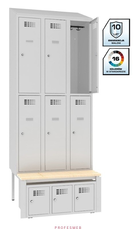 Szafa metalowa na klucz Sus 332 Malow BHP skrytkowa 6 drzwiowa z ławką stała P 333 szafką na obuwie Snb 333 i daszkiem skośnym 239x90x74,5cm