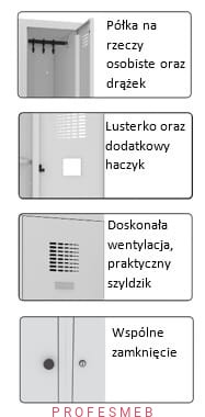 • Przeznaczone do przechowywania odzieży (wysokie komory) i rzeczy osobistych w pomieszczeniach wewnętrznych suchych i wentylowanych.