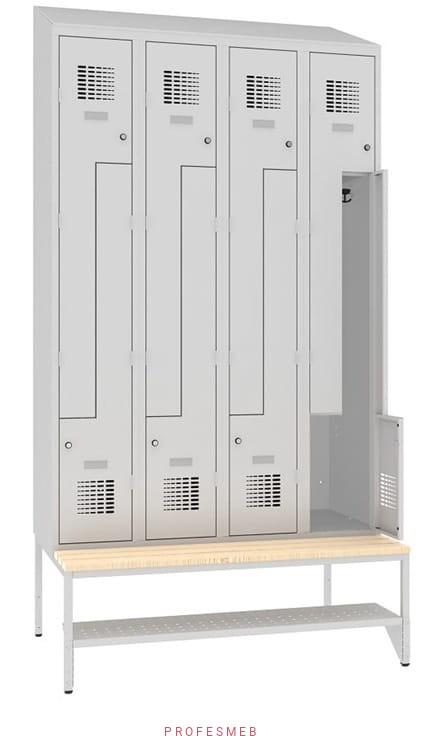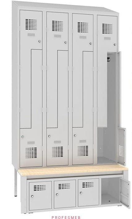 - opcja wykonania szafki ubraniowej BHP z ławeczką z listwami z drewna lub PCV i dodatkową półką na buty