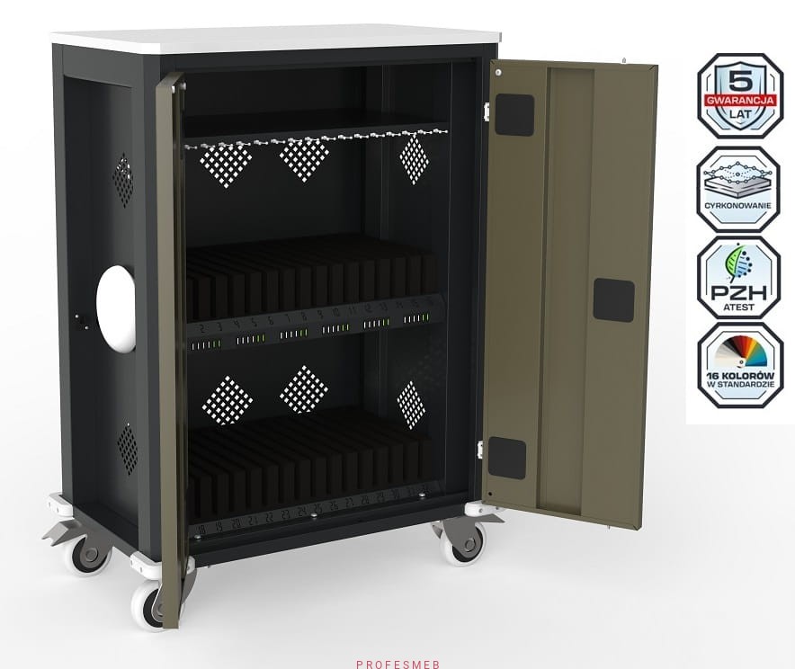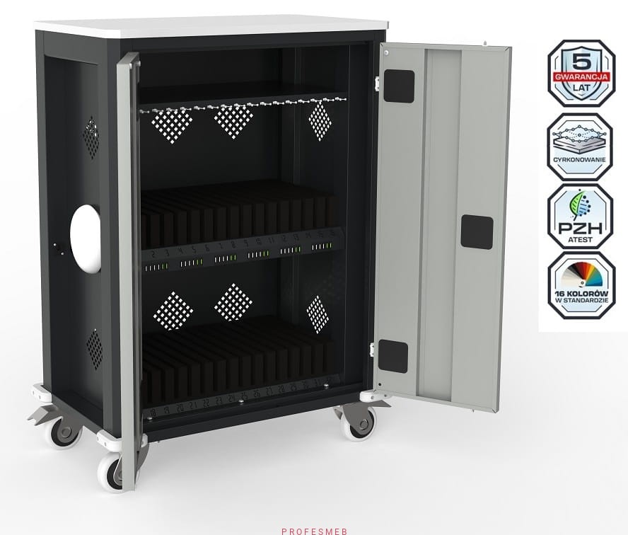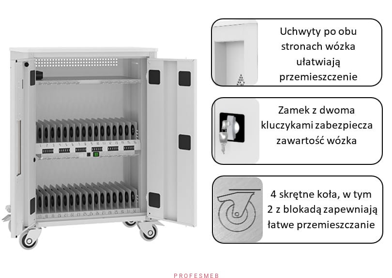 Niezawodność i funkcjonalność są kluczowymi cechami tych wózków. Wykonane z wysokiej jakości materiałów, zapewniają trwałość i długotrwałe użytkowanie. Wózek został zaprojektowany tak, aby zapewnić maksymalne bezpieczeństwo dla urządzeń elektronicznych. Każde miejsce na tablet jest indywidualnie wyściełane miękkim materiałem, który chroni urządzenia przed zarysowaniami i uszkodzeniami podczas transportu.