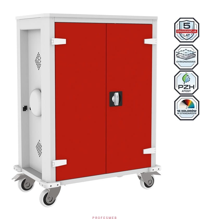 ✅ Zawartość szaf jest chroniona przez drzwi wyposażone w 2 pkt. zamek. Dodatkowo perforacja na wózkach zapewnia odpowiednią cyrkulację powietrza wewnątrz urządzenia.